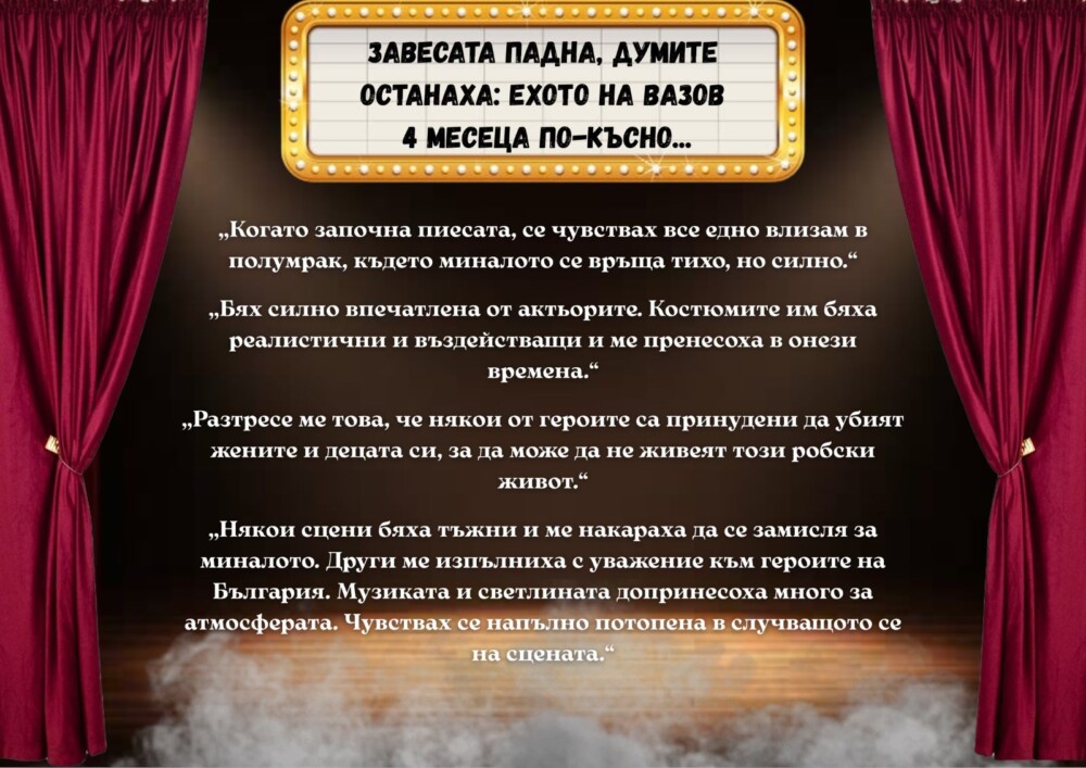 Учениците от 10.б клас отправиха поздравително писмо за Деня на театъра до актьорите на ДТ „Адриана Будевска“. То съдържа фрагменти от техни текстове, провокирани от посещението на постановката „Епопея на забравените“.