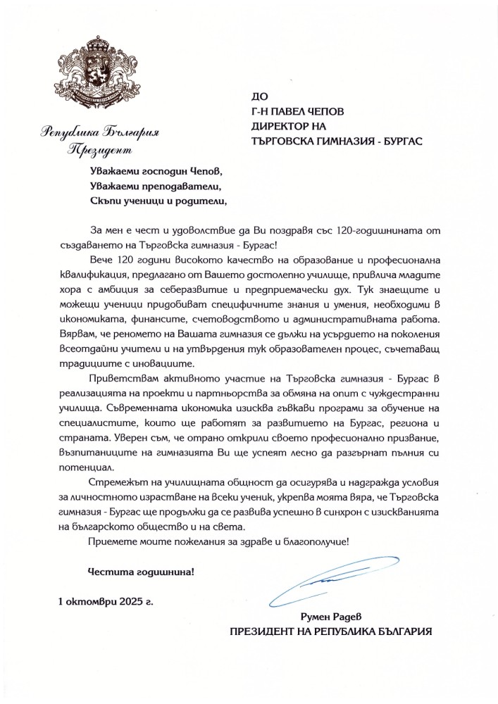 По повод 120-годишния юбилей Президентът Румен Радев удостои гимназита с плакет „Св. св. Кирил и Методий“. Той изпрати и поздравителен адрес, в който изрази уважението си към мисията на учителите и ролята на училището в изграждането на предприемчивия дух на нацията.