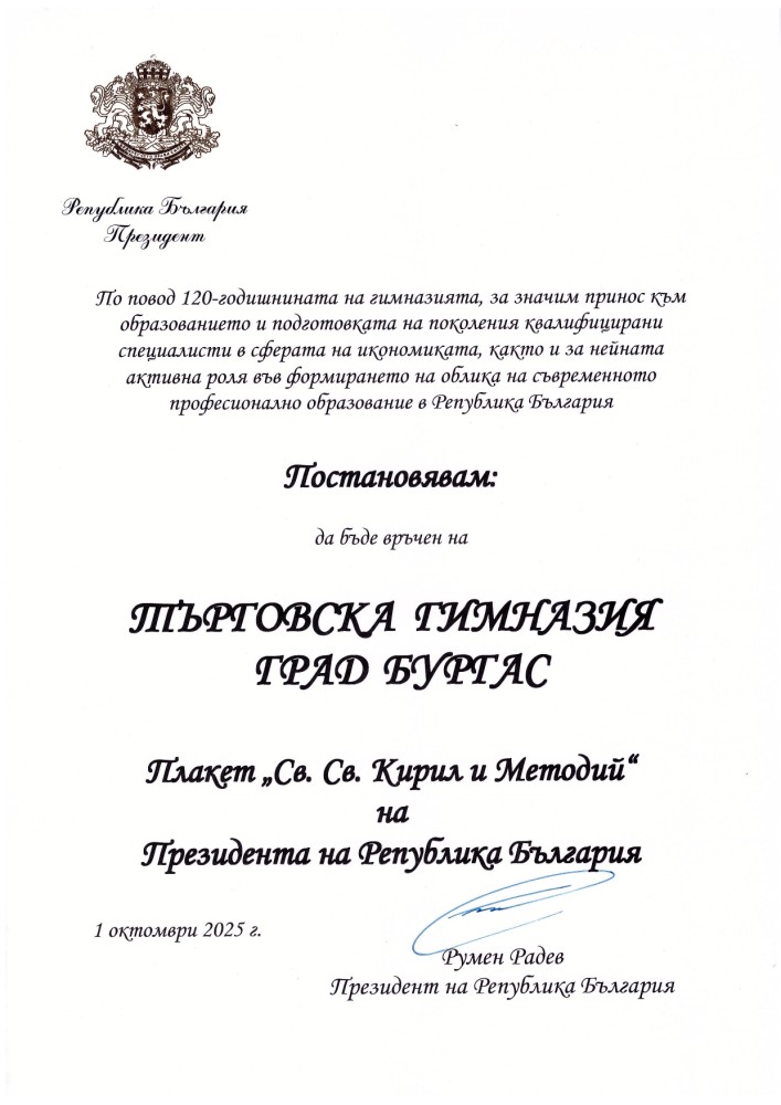 Плакет „Св. Св. Кирил и Методий“ на Президента на Рупублика България за Търговска Гимназия !